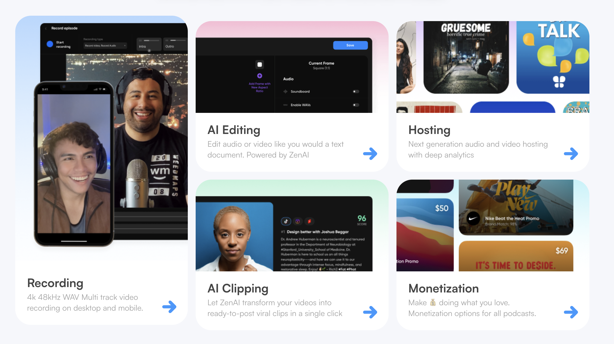 The Standard plan gives you everything you need to launch and run a podcast: unlimited recording in high-quality audio and 1080p video, multitrack separation, basic ZenAI editing, transcriptions, and full hosting with distribution. It’s the right entry point if you’re a solo host producing one show and don’t yet need 4K video or social clipping tools. Since it bundles recording and hosting together, it can actually save money compared to paying for separate tools — most standalone podcast hosts charge $12–$15/month just for hosting.